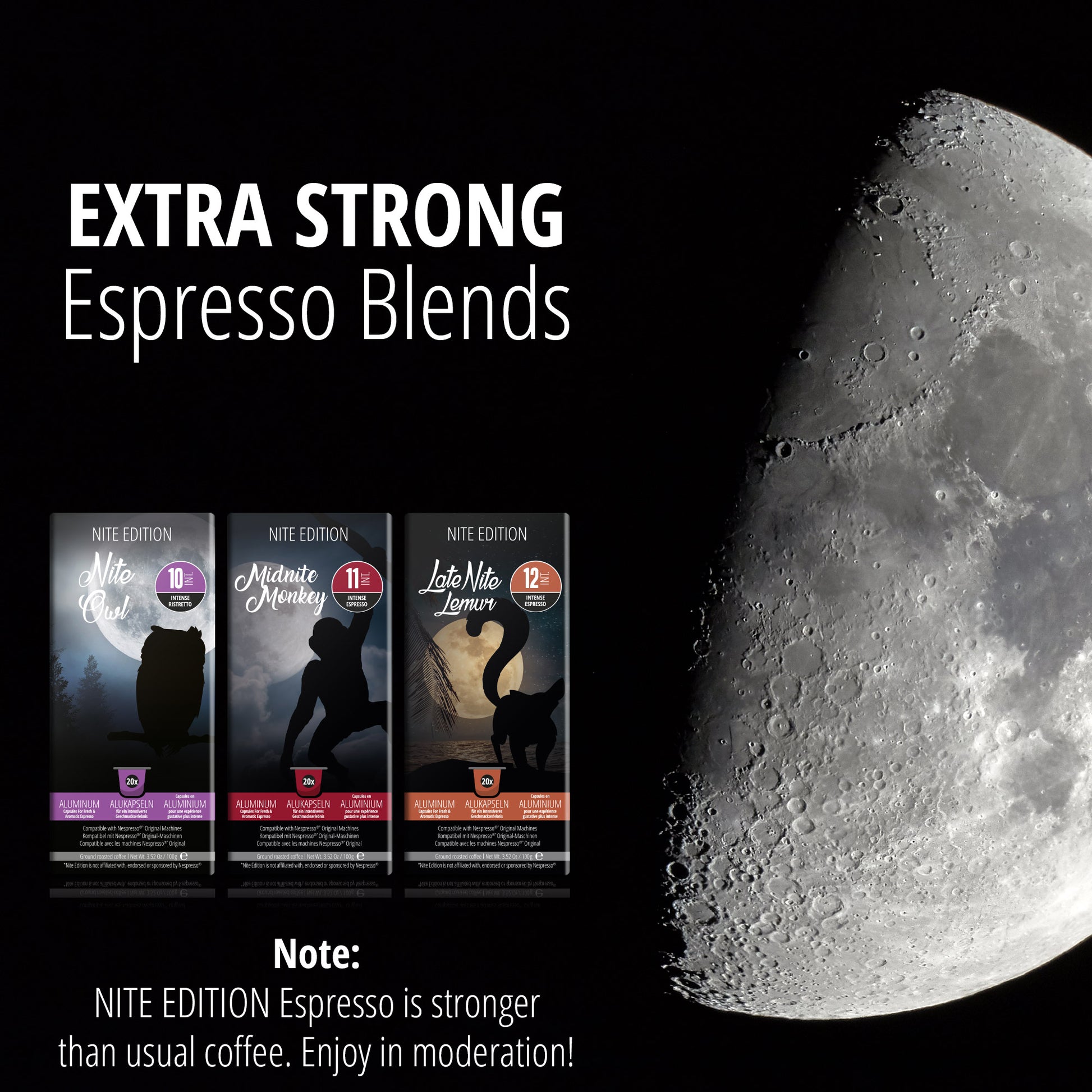 The Nite Edition Late Nite Lemur blend is the strongest of our selections (Intensity 12). This espresso has a balanced taste and full body and is notable for its citrus notes and light finish.