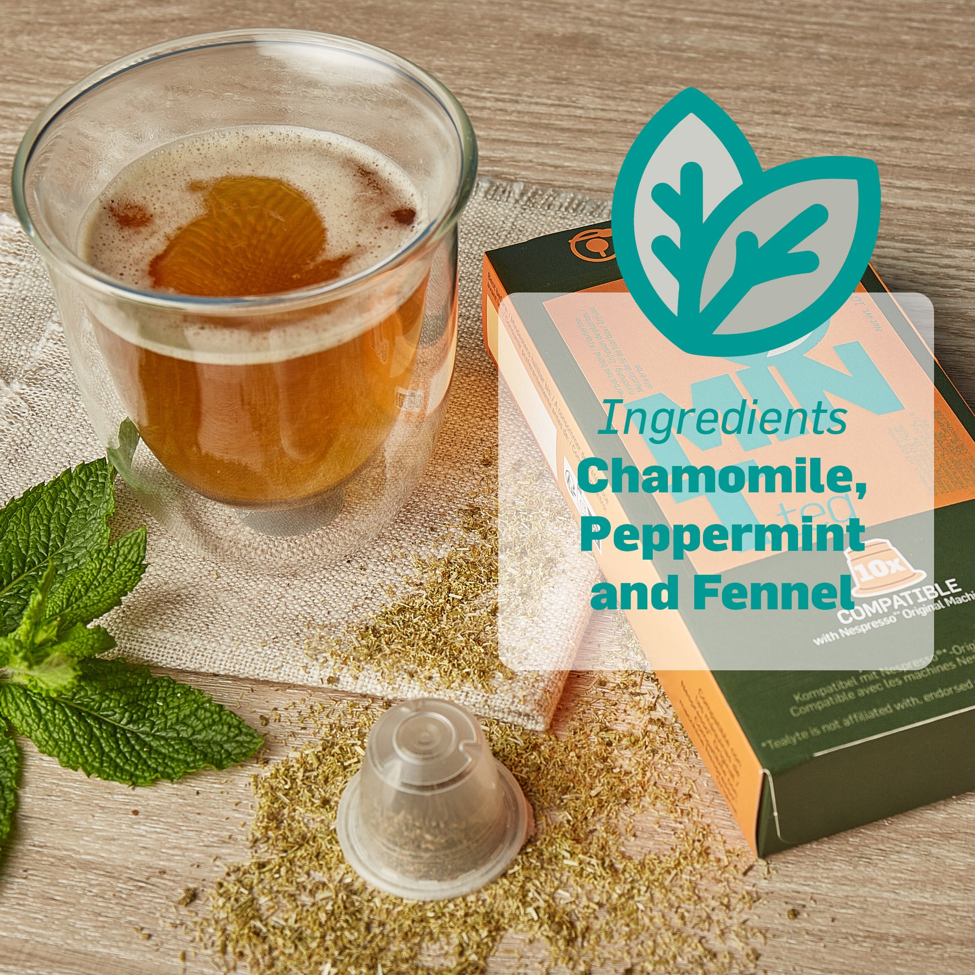 This peppermint tea combines fragrant peppermint, calming chamomile, and aromatic fennel. Does not contain caffeine.